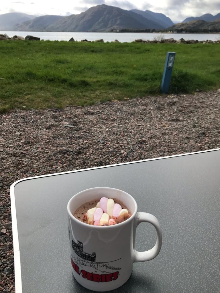 Once back at site we rested, showered and had lunch. When then spent a lovely couple of hours sitting looking at the view. It was even nice enough to sit outside. At one point I took my jacket off, typically the sun went back in at that point. We had found a packet of flumps that we had packed. Perfect for a hot chocolate with a view.