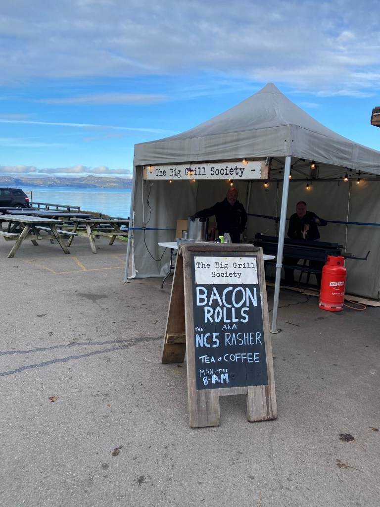 On the way back I sat looking at the bay and got chatting to the blokes operating the bacon sandwich place. Sadly they had no hot chocolate so I headed back to the van to collect Pat and a sachet of hot chocolate. What an absolute treat, an awesome sandwich in and even better location